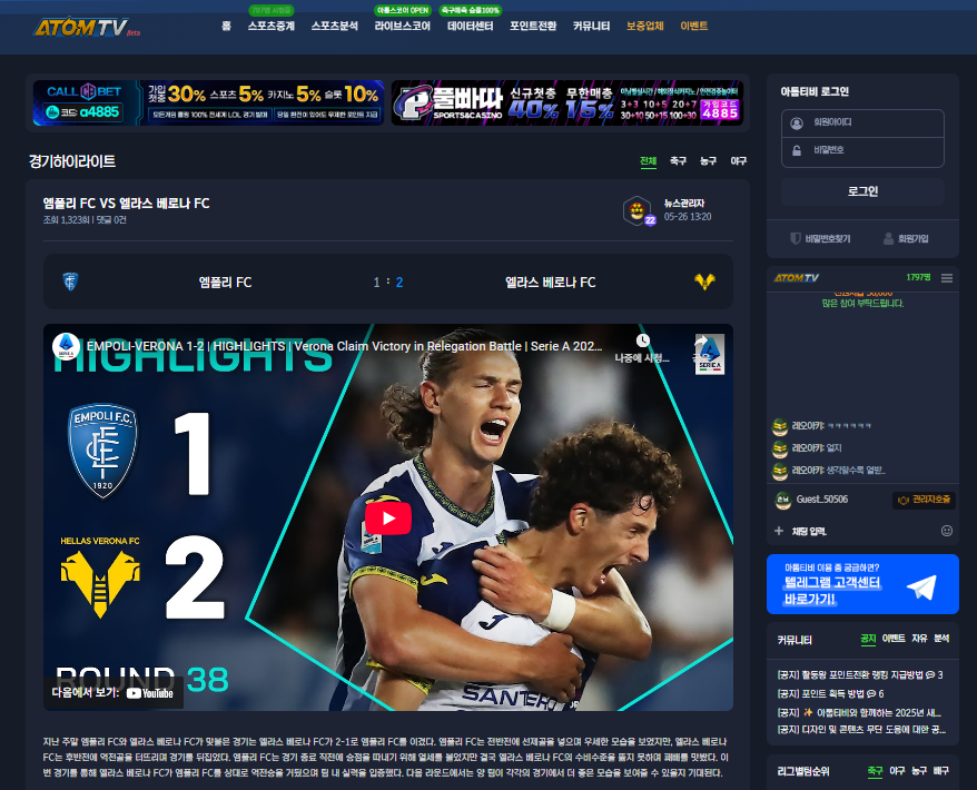 아톰티브이(https://www.attv24.com)는 다양한 스포츠 경기를 실시간 고화질로 제공합니다. 그중에서도 축구 팬들 사이에선 거의 필수 사이트처럼 여겨지죠! 무료인데도 FHD 화질로 경기 시청이 가능하고, 챔피언스리그나 EPL처럼 인기 많은 리그도 빠짐없이 중계됩니다.